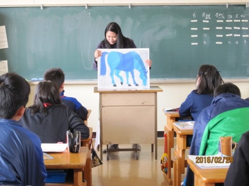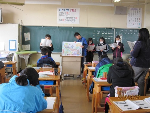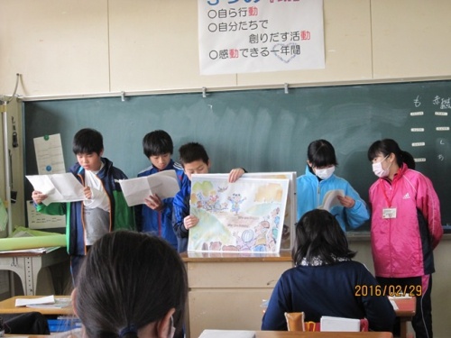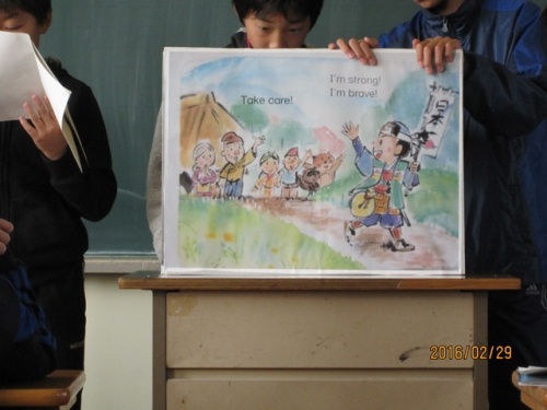 6年生は、自分たちで作った大きな紙芝居(英語バージョンの「桃太郎」です)の発表会をカスリン先生に見ていただきました。最後には、カスリン先生が、「くまさんくまさん なにみてるの」の紙芝居をしてくださいました。