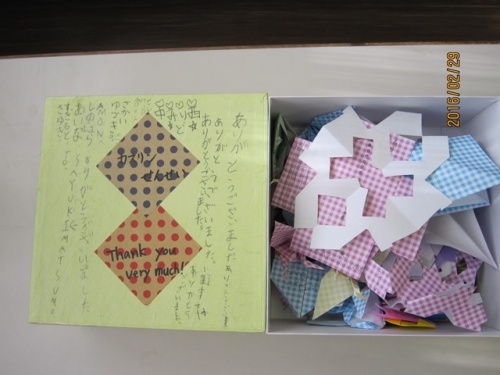 5月からALTとして英語を教えてくださっていたカスリン先生が、今日で最後となりました。1年生の子どもたちが、感謝の気持ちを込めて、折り紙でいろいろなものを作り、カスリン先生にプレゼントしました。