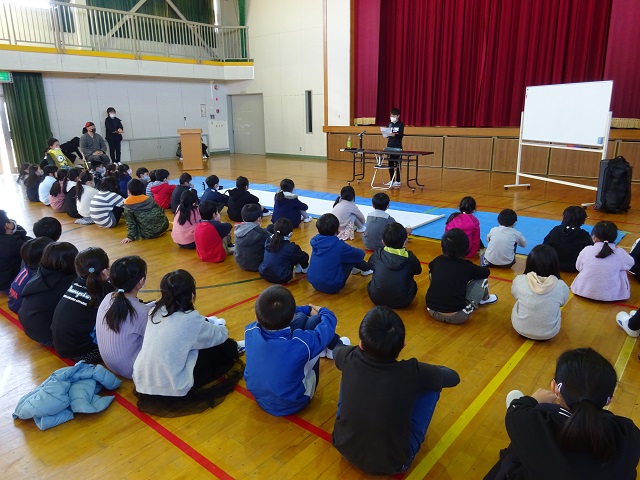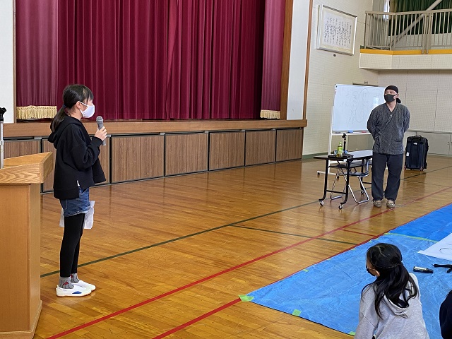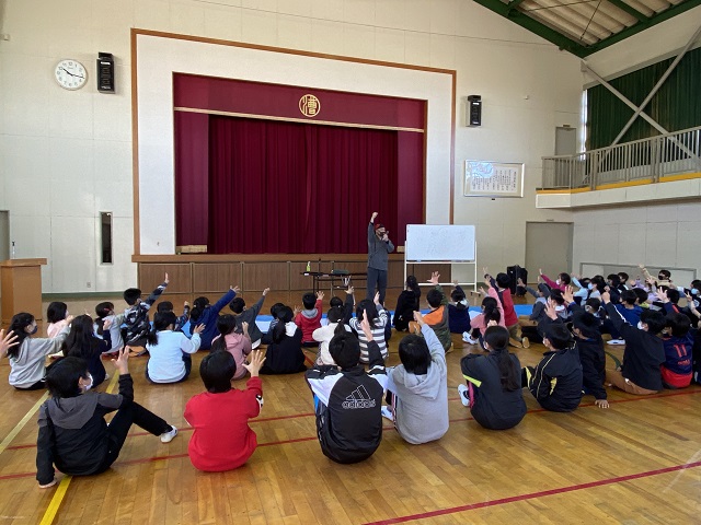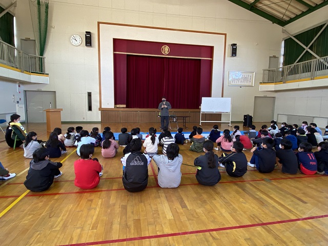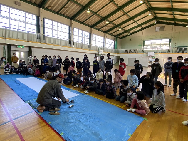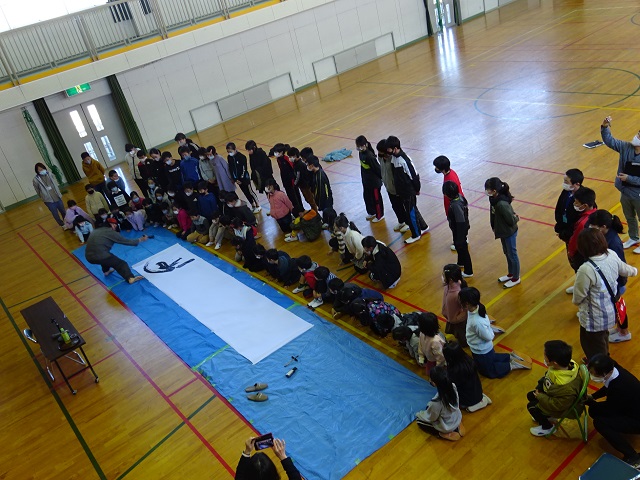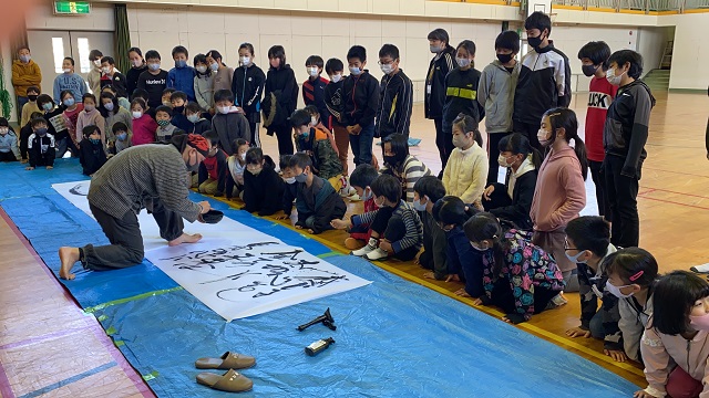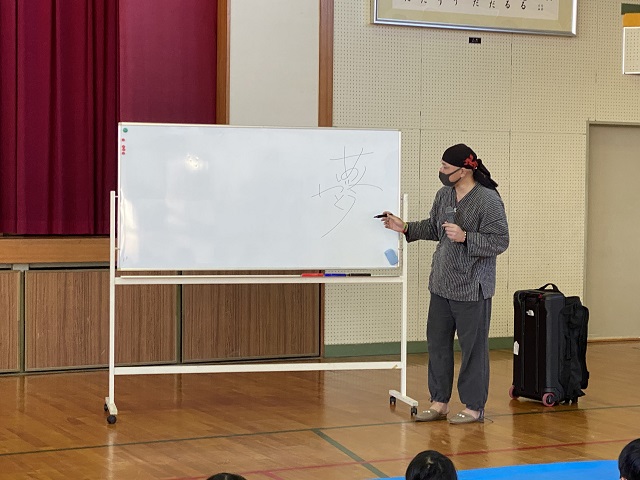 2限目は文字職人の杉浦誠司先生をお招きして、人権講演会を行いました。「夢・ありがとう」は誰もが知っている「めっせー字」をつくられた先生です。幼少期に受けたいじめ体験からいじめはいじめている人もいじめられている人も周りの人もつらいということ、今の現状を人のせいにすればするほどつらくなることなどをじゃんけんや人を指差すこと(人のせいにするしぐさ)を実際にやってみることでわかりやすく話していただきました。最後にはパフォーマンスで「光・いのち」のメッセージをいただきました。ご家庭でもお話を聞いていただければと思います。