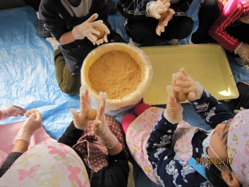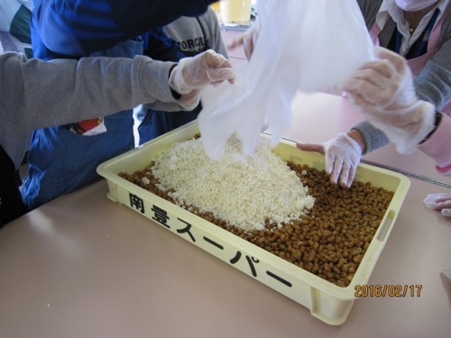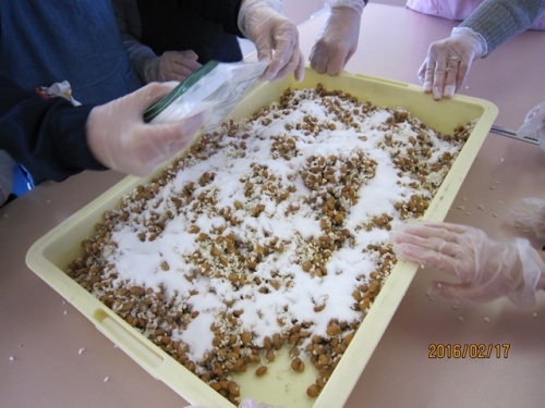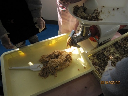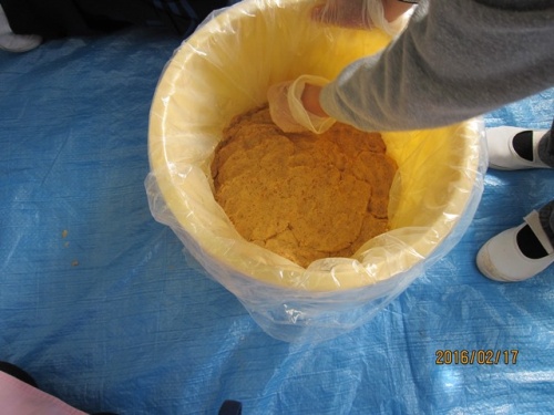 伊勢場の農場で種まき・豆たたきをさせていただいた大豆「ふくゆたか」を使いました。まずは、蒸した大豆と米こうじをまぜます。次に、お塩と湯ざましを入れて、またまぜます。まぜたものをミンチ機に入れて細かくします。ミンチ状になったのを、手で丸めて空気を抜いて、ポリ容器に入れていきます。ここでも、空気を抜くように押さえていきます。途中手を加えていきますが、このままねかせて11月には食べることができるそうです。
