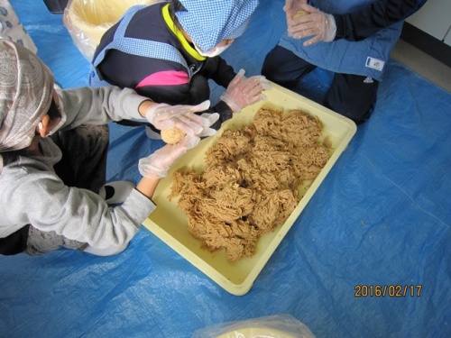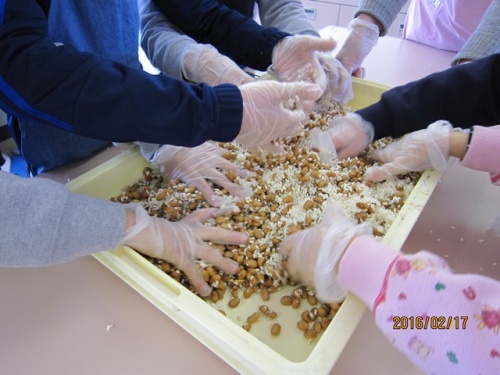 17日(水)JA松阪くらし福祉課の方、お二人に学校に来ていただいて、1・2年生がみそ作りの体験学習をしました。