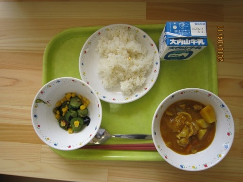 11日(月)から給食が始まりました。今日の献立は、「ごはん、ポークカレー、牛乳、海藻サラダ」でした。