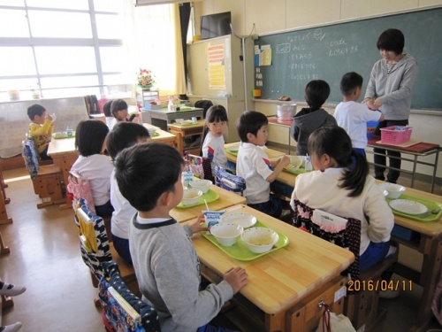 1年生も今日から給食が始まりました。1年教室では、「おなかいっぱいや。」「もっと食べたい。」「給食おいしいわ。」などの声が聞こえました。全員がきれいに食べていました。
