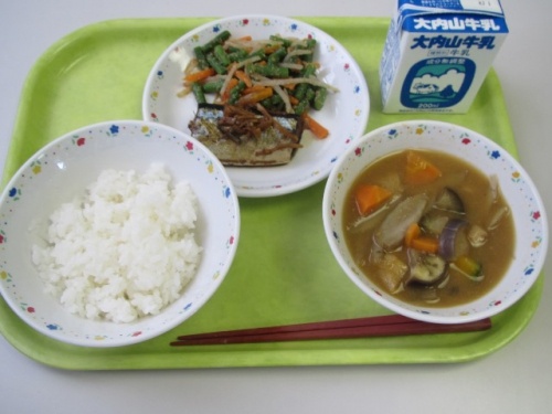 今日は、和食の日でした。主食が「ご飯」、主菜が「さんまの煮付け」、副菜が「もやしとさやいんげんのごま和え」、汁物が「盆汁」の主食・主菜・副菜・汁物がそろった献立です。和食は、ご飯を中心にして、野菜、豆類、魚介類、海藻などをバランスよく取り入れた食事で、健康に良いとされ、世界中から注目されています。また、汁物の「盆汁」は、夏野菜を使った具だくさんの味噌汁で、お盆の時期に食べる三重県の郷土料理です。お盆に盆汁を食べると健康に過ごせると言われています。