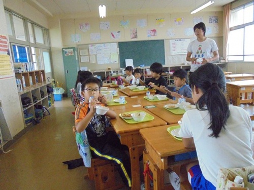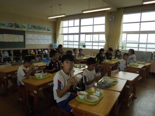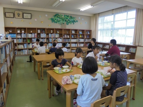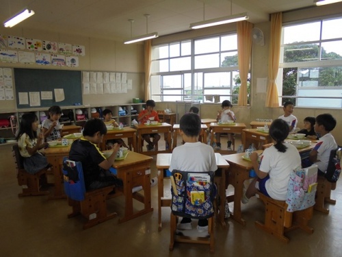 まず、各教室で配膳の後、5・6年生が1・2年生を迎えに行き、各班で決められた教室に行き、班のみんなで給食を食べました。お天気が良かったら、外で食べる予定だったのですが、残念でした。