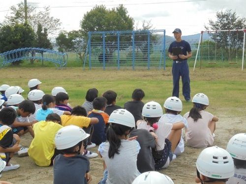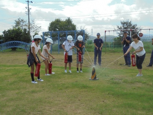 28日(水)に火災を想定した避難訓練を実施しました。家庭科室より出火した想定で、みんなが東階段を使って運動場に避難しました。松阪南消防署より3人の方に来ていただき、お話を聞いたり、消火器の使い方について教えていただきました。6年生7人が代表で消火器消火の体験を行いました。