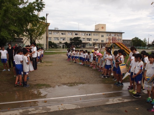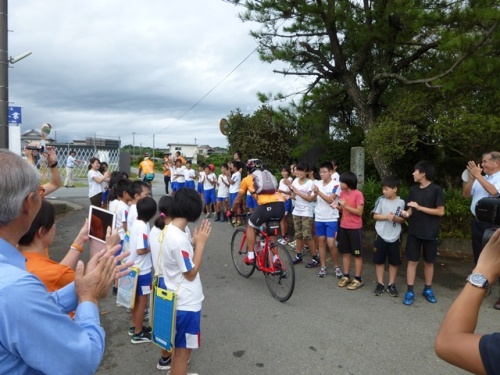内宮前を出発したタスキがリレーでつながれ、松阪市にやって来ました。漕代小学校は最初の中継点。子どもたちや地域の人たちの拍手に迎えられゴールインしたタスキは、次の中継点の小片野町に向かう自転車隊につながれました。