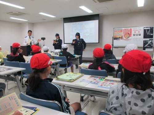 最初は、松阪警察署に行きました。警察官の服装をした女性警察官2人の方に服装や持ち物を教えてもらいました。手錠・警棒・警察手帳を実際にさわらせていただきました。ドラマで見るのと一緒で、感激しました。