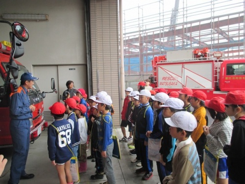 次は、松阪中消防署に行きました。いろいろな消防車を見せていただきました。あいにくの雨でしたので、はしご車を伸ばしていただくことはできませんでした。昔は、「119」ではなく「112」だったという話を聞いてびっくりしました。