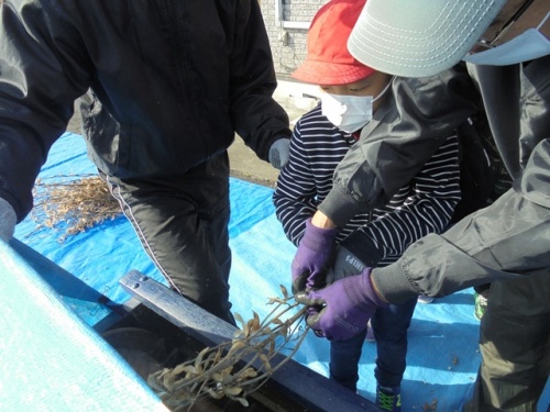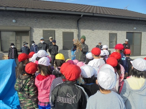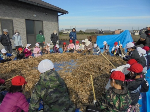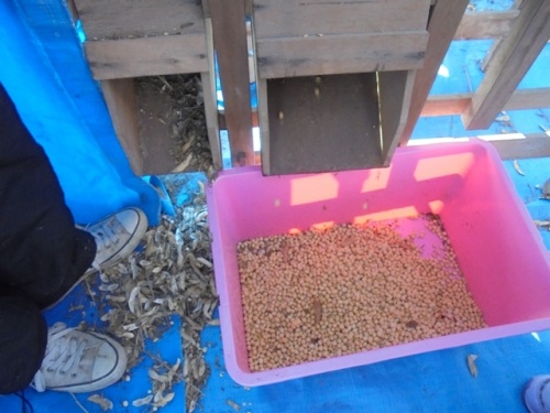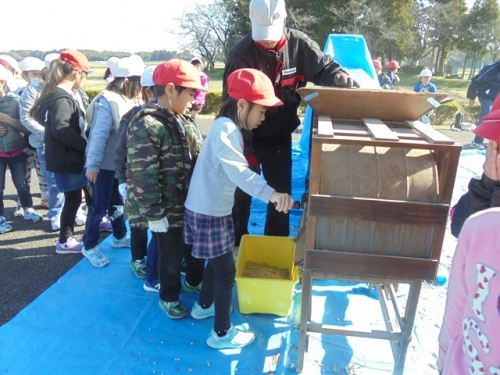 25日(金)に幼稚園児・1年生・2年生が伊勢場の集会所で豆たたき体験をさせていただきました。からからに干した大豆を竹の棒でコンコン叩いて豆を出します。脱穀機で豆をおとしたり、とうみで豆とごみを仕分けたりする体験もさせていただきました。
