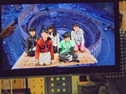 先ずは、「不思議!放送体験」で、プロンプター体験やクロマキー体験をさせていただき、模擬番組を制作しました。全員の集合ショットを撮影した後は、「納得!NHKなんでも学習」で放送局や番組作りなどについて教えていただきました。
