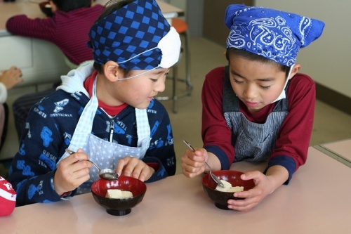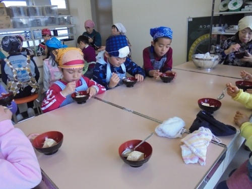 出来立ての温かい「おぼろ豆腐」も味見させていただきました。大豆の甘さが一段とひきたっていたようです。完成した豆腐はまず、そのまま食べました。何もつけなくても、大豆の甘味をほのかに感じ、買ったお豆腐とは全く違う何ともやさしい味のおいしいお豆腐でした。豆腐が苦手と言っていた子もすっかり完食でした。