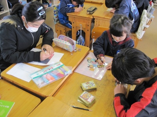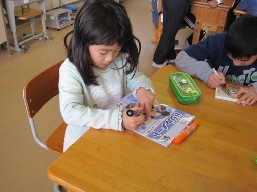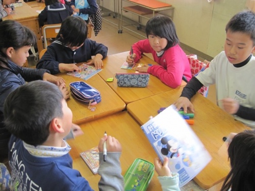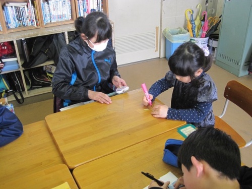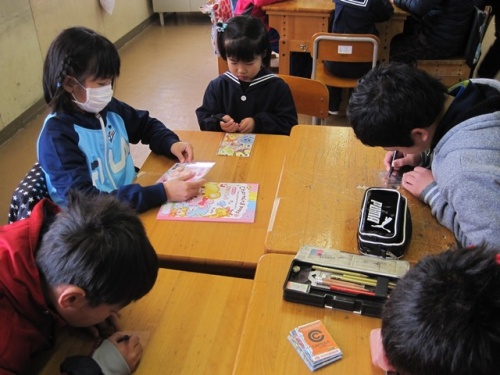 保護者の方は、図書室で話を聞いていただき、その間、新1年生の皆さんは、5年生のお兄さん、お姉さんと過ごしました。まずは、5年教室でグループに分かれて「プラ板」作りをしました。その次は、運動場に行って「しっぽとり」をしました。出来上がった「プラ板」はお土産に持って帰ってもらいました。