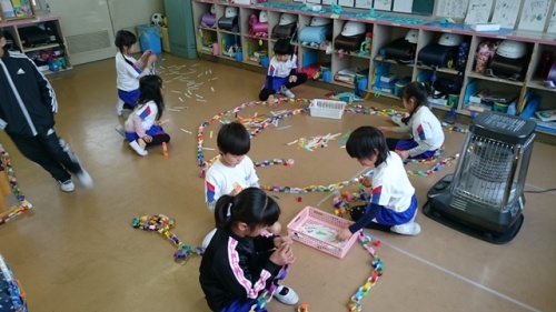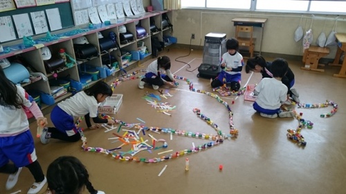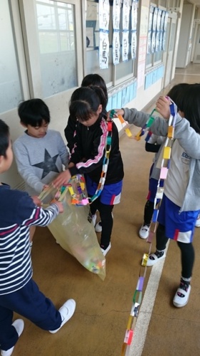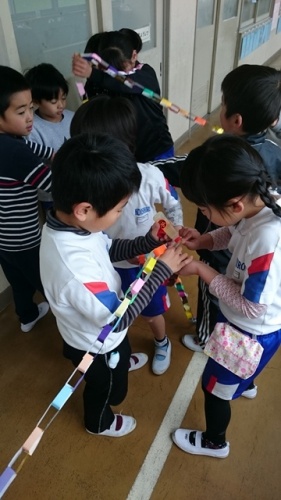 1年生教室では、廊下に飾る紙の「くさり」の製作中。みんなが手分けして細長く切った色紙をわっかにしてつないでいました。「くさり」はどんどん長くなり、2階廊下とほぼ同じ長さになりました。