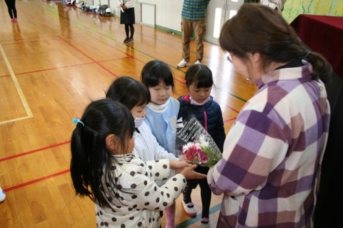 離任式では3人の方が離任されました。お一人ずつお言葉をいただきました。年月の長短はありますが、いずれの方も漕代幼稚園漕代小学校のためにご尽力いただいた方々です。本当にありがとうございました。