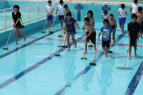 8日(木)の予定でしたが、悪天候のため一日延期して、今日9日(金)の5・6限目に5,6年生がプール掃除をしてくれました。