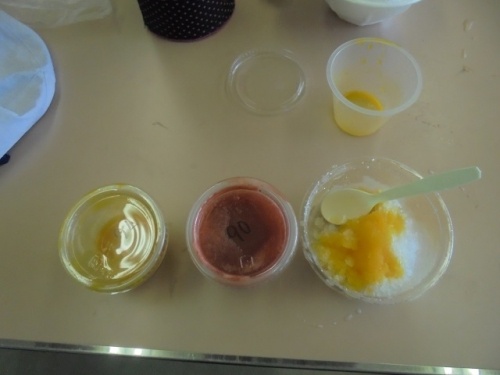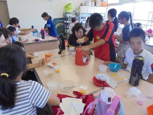 その後は、家庭科室で、かき氷を楽しみました。自分たちでガリガリと氷をかき、イチゴ・マンゴピューレを使った特性シロップで、美味しくいただきました。