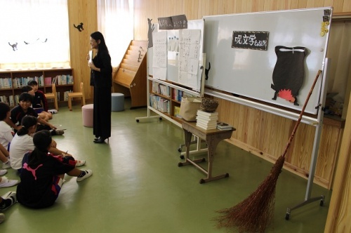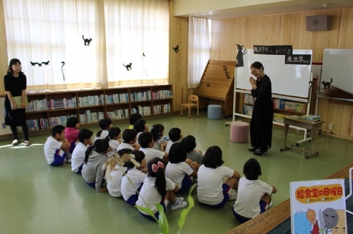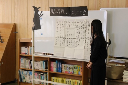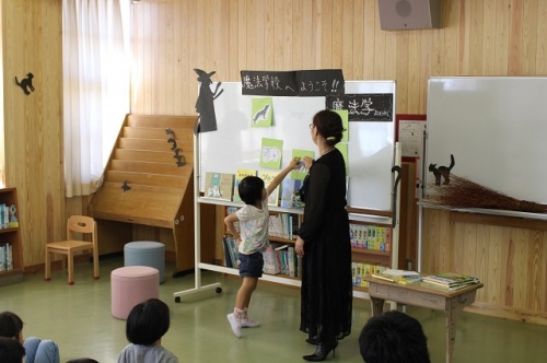 三雲ハーブルの会の皆さんにお越しいただいて、アニマシオンをしていただきました。今年は、「魔法の学校へようこそ」というテーマで、魔女が学校にやってきました。
