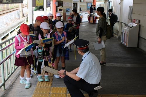 最初の見学地 近鉄松阪駅では、助役さんからお客さんが利用しやすいように工夫した所を教えていただきました。はじめて知ることが多く、子どもたちは助役さんから教えてもらったことを一生懸命にメモしていました。