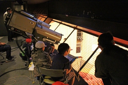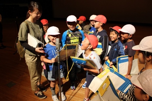 次の見学地 クラギ文化ホールへは路線バスに乗り、自分たちでお金を払う体験をしました。クラギ文化ホールでは、ふだんは見ることのできないバックヤードを探検。照明や音響の機会を実際に操作させてもらい大喜びの子どもたちでした。