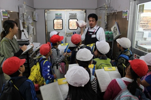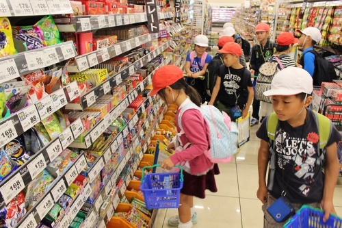 鈴の森でお弁当を食べたあと、最後の見学地マックスバリュ川井町店を見学。ここでもバックヤードを探検させてもらい、たくさんのことを学ばせていただきました。そして最後は楽しみにしていた買物タイム。自分たちのすきなお菓子を買いましたが、300円の予算をオーバーしてあわてる子どももいましたが、上手に買い物ができました。