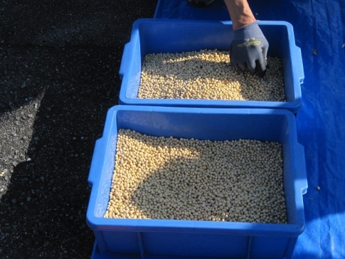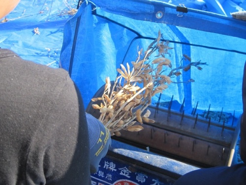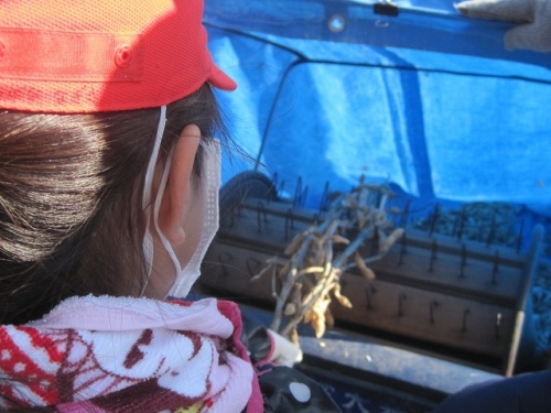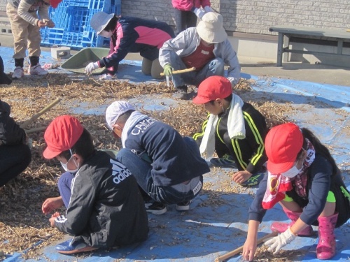 11月28日(火)に幼稚園児、1年生、2年生が伊勢場の体験農場で、豆たたきを体験しました。6月に種まきをした「ふくゆたか」を昔ながらの方法で、竹でたたいたり、脱穀機で豆をはずしたり、とうみでごみと豆を選別したりしました。竹の棒では、元気だけど結構優しめにたたいていました。脱穀機では、引っ張られないように踏ん張っていました。とうみでは、豆がつるつるになったと感激していました。今年は、やっぱり豆も豊作でした。今年は、この豆を使って、味噌つくりをします。