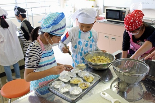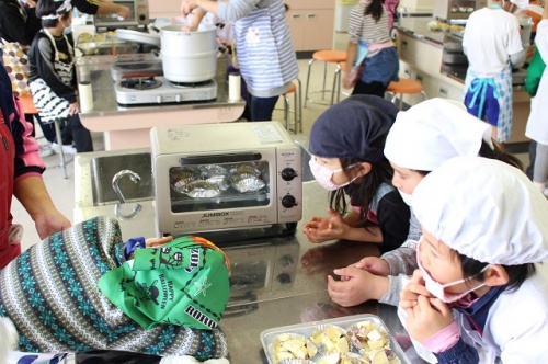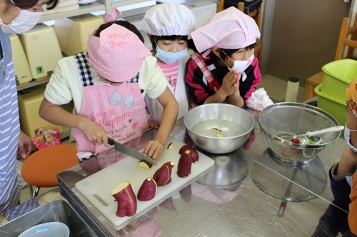 固いさつま芋でしたが、緊張しながらも、上手に楽しそうに切っていました。2年生が1年生をよくリードし、1年生は2年生の話をよく聞き、上手に調理実習ができました。