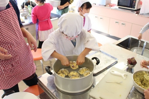 伊勢場の農場で収穫したさつま芋を使って「おにまんじゅう」と「スイートポテト」を作りました。