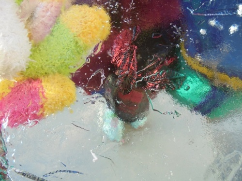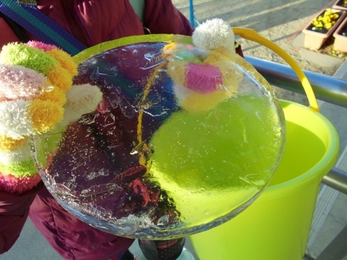 写真の氷は、昨夜のうちにバケツに水を張っておいて作ったのだそうです。1センチ以上の厚さで、氷には葉っぱの模様もうつっていました。
