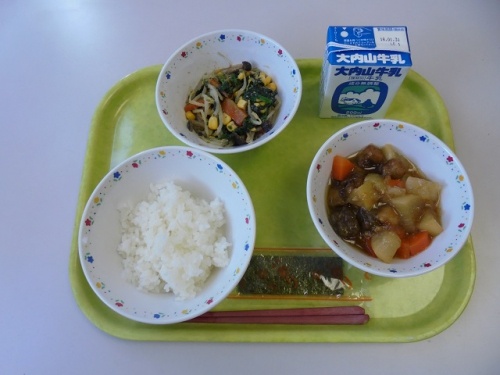 今日の献立は、ご飯、牛乳、大根とぶりの揚げ煮、松阪しめじとほうれん草のあえもの、味付けのりでした。今日は、松阪しめじが入った和え物でした。松阪しめじは松阪で栽培され、一定の温度に保った部屋の中で約100日間育てられ、その後収穫するそうです。