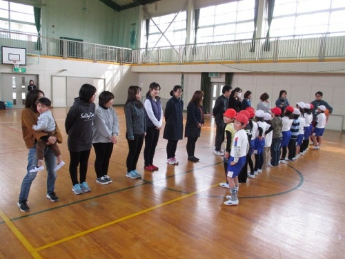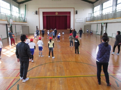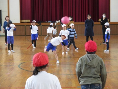 10時20分から、体育館で親対子でドッジボールの試合をしました。1人差で子どもチームが勝ちました。