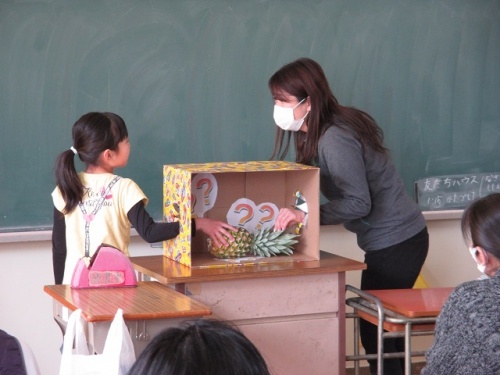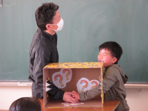 その後は、教室に移動して、箱の中身を当てるゲームをしました。糸こんにゃくやパイナップルやけん玉、くものおもちゃなどがあって、たいへん盛り上がりました。