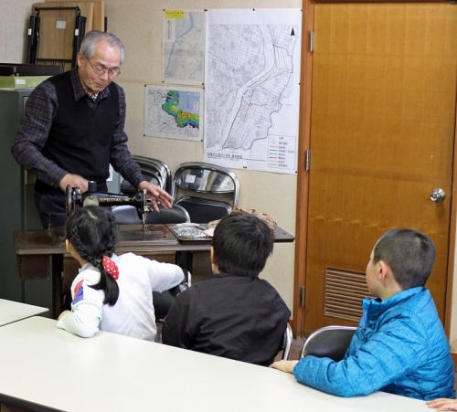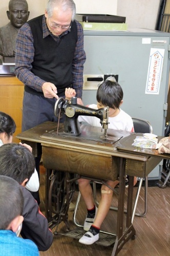 お家から持ってきていただいた、館長さんのお母さんが実際に使ってみえた足ぶみミシンを使って、お母さんとのエピソードも交えながら裁縫の歴史について教えていただきました。実際にミシンを動かしてみたこどもたちは、最初はとまどったものの慣れてくると上手に動かすことができるようになりました。