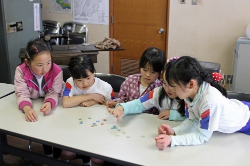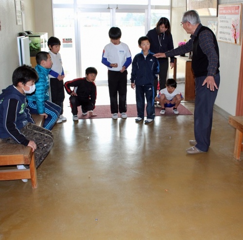 続いて昔の遊びについてのお話では、館長さんがよく遊んでいたビー玉、おはじき、メンコの体験もさせていただき、子どもたちは目を輝かせて夢中になって遊んでいました。