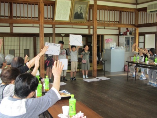 早馬瀬公民館、法田公民館、稲木公民館の会場に子どもたちも3つのグループに分かれて参加しました。劇、クイズ、紙芝居を皆さんの前で発表しました。行く前は「緊張する」と言っていた子どもたちですが、堂々としていました。大きな拍手をいただき、嬉しそうでした。