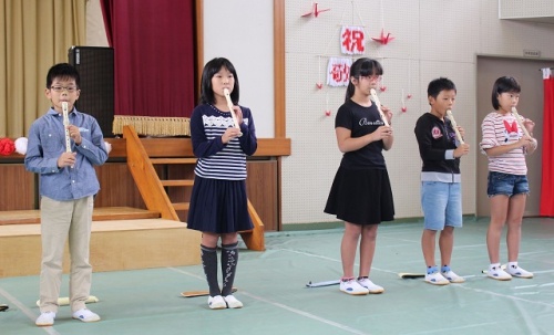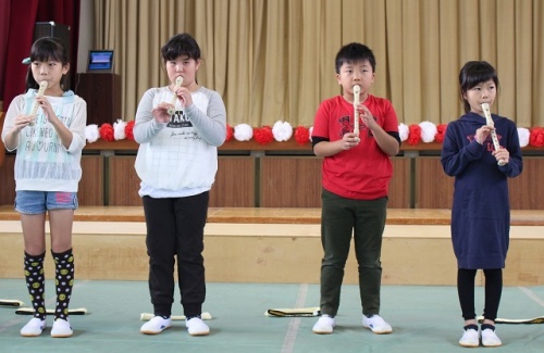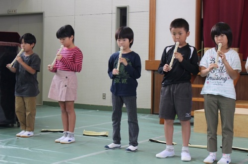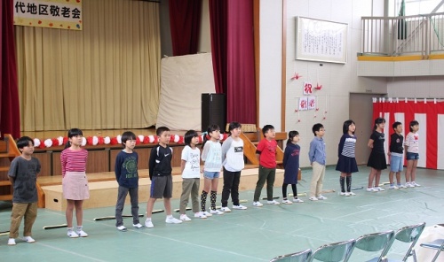 昨日は漕代地区の敬老会が小学校体育館で行われ、3年生のみんなが出演しました。リコーダー演奏と合唱を披露しました。参加の皆さんには喜んでいただけたようです。東部中学校のブラスバンド演奏、地域の方のコーラス、第四包括センター・社会福祉協議会の運動・お話、カラオケが行われました。