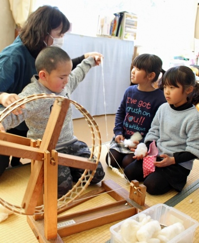 国語の学習で「たぬきの糸車」という単元があります。おかみさんがキーカラカラ キークルクルと糸車をまわしていると、やぶれしょうじのあなから二つのくりくりした目玉が…教室では1年生の子どもたちがキーカラカラ キークルクルと元気に音読をしています。今日はおかみさんのように糸車を上手にまわしていました。自分で紡いだ糸もお土産にいただき、楽しい糸つむぎ体験でした。