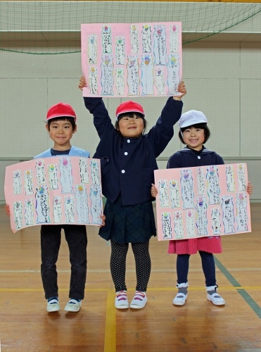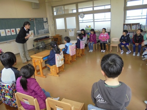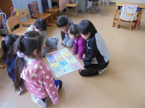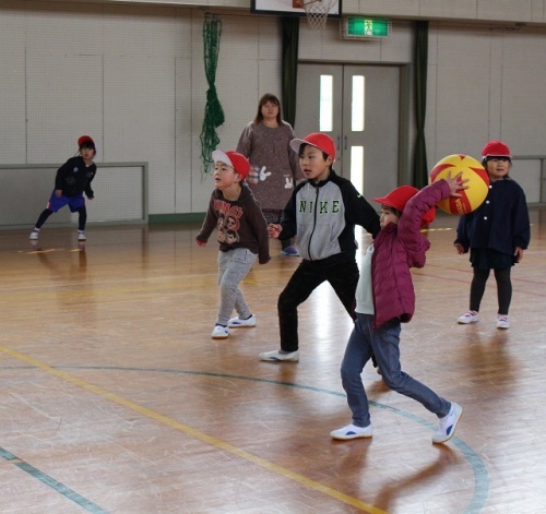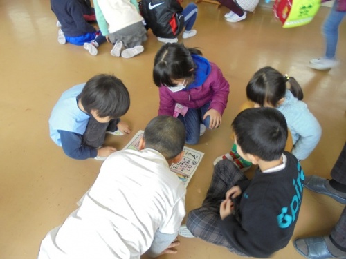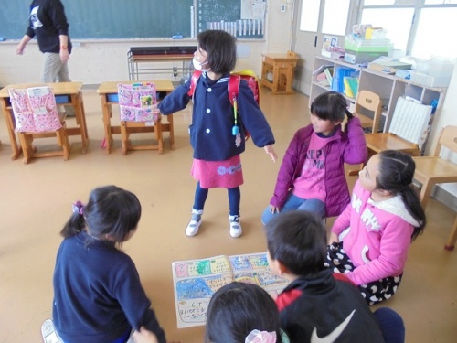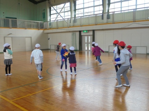 1年生教室ではちょっぴり1年生体験をしたりすごろくを楽しんだりしました。次に体育館へ移動し、みんなでドッジボールをしました。最後に1年生から幼稚園のみんなへお手紙のプレゼントを渡しました。幼稚園のみんなの前で、1年生はお兄さんお姉さんにみえました。1年間で立派に成長しました。
