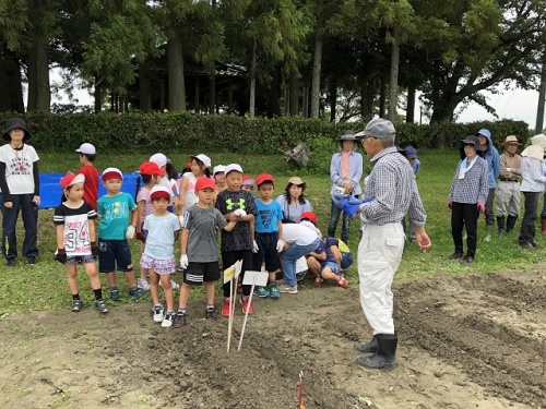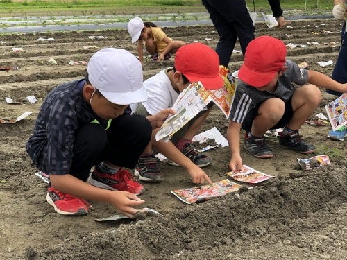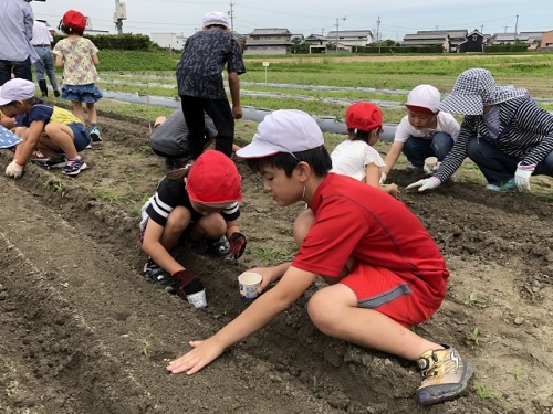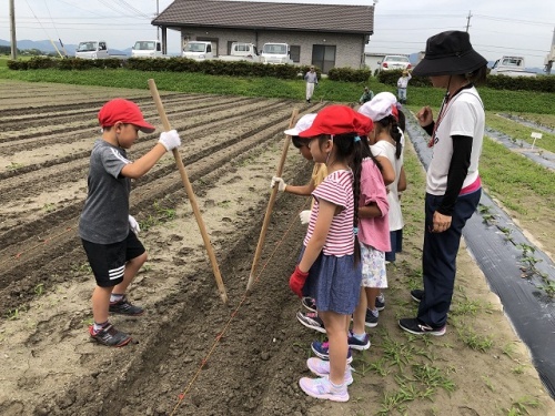 伊勢場のふれあい農園で今日は「ふくゆたか」という品種の大豆の種まきをしました。説明を聞いた後2年生が棒で穴をあけた所に3粒ずつまきました。畝と畝の間に広告で鳥よけも作りました。数日後には芽が出る様です。隣の畝には先日植えたさつまいものつるが元気に育っていました。伊勢場の皆さん、ありがとうございました。