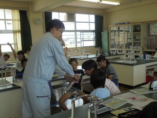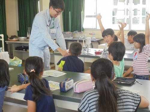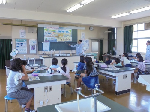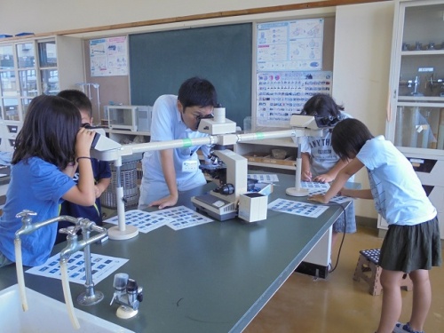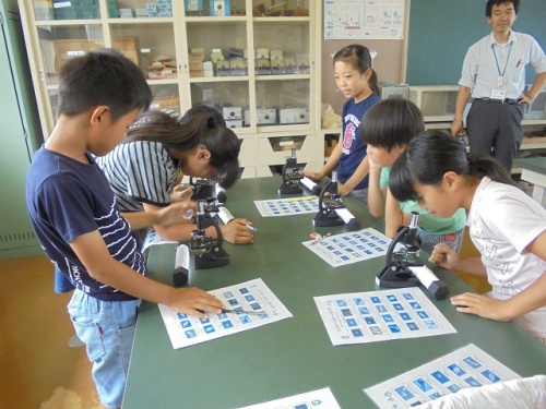 松阪浄化センターの方に来ていただき、「下水道について」学習をしました。生活排水がどのようにして処理されているのかをイラストや簡単な実験でわかりやすく教えていただきました。最後に水をきれいにしてくれる微生物を顕微鏡で観察しました。微生物の働きに驚きながら「クマムシ」「アルケラ」…たくさんの微生物を見つけることができました。