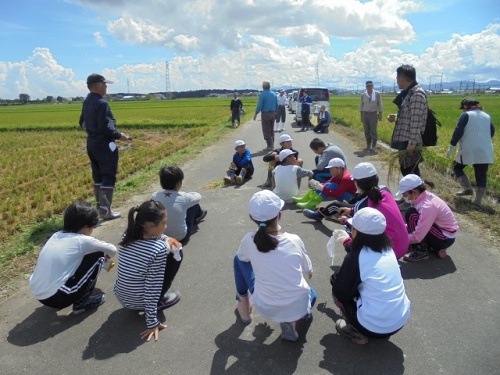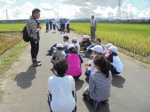 地域の皆さん、営農組合の皆さん、オペレーターの皆さんにご協力をいただき、稲刈り体験をしました。春田植えを体験して4カ月が経過し見事に実った稲。稲刈りが初めての子がほとんどでしたが、鎌の持ち方や刈り方を教わった後実際刈ってみました。最初は恐る恐る鎌を使っていた子もだんだん要領が分かってきたようでどんどん刈っていきました。最後はコンバインで一気に刈っていく様子を「速い」と感心しながら見つめていました。貴重な体験をさせていただき、ありがとうございました。