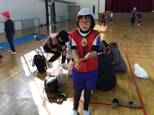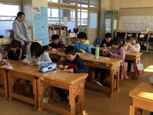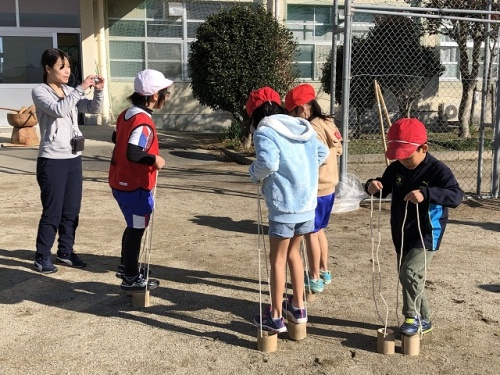 月影会のみなさんに昔の遊び(竹馬、竹ぽっくり、こま、あやとり、お手玉、竹トンボ、輪投げ)のコーナーを設定していただき、子どもたちはグループに分かれて楽しみました。遊び方が分からないと優しく教えていただき、できるようになるとほめていいただき、できないと励ましてくれたりしまいた。ゲームの後は3年生が餅つき体験をしました。お餅は全校児童が2つずつおいしくいただきました。月影会のみなさん、ありがとうございました。