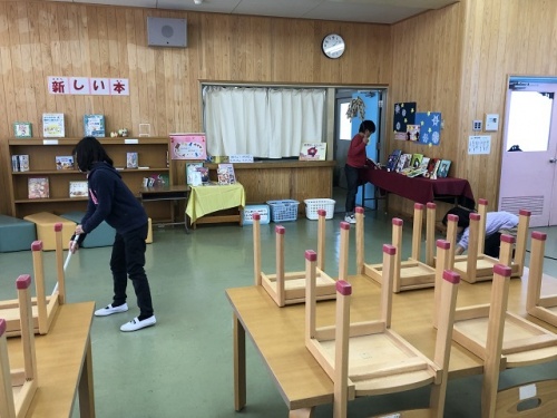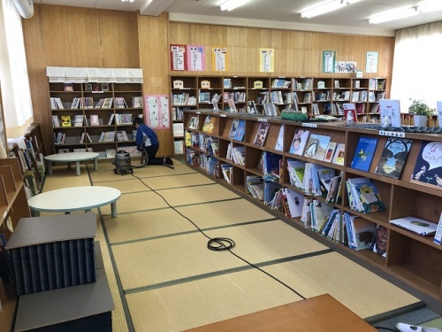 1年生は1年生教室と1階廊下を担当しています。図書室は4年生がやってくれていました。広い図書室を4人でてきぱきと進めていました。