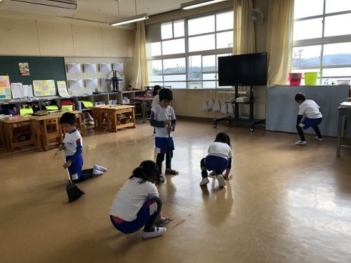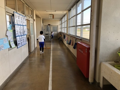 月曜日は学級そうじの日です。他の曜日はなかよし班で校舎を分担してきれいにします。1年生もなかよし班のそうじではき方やふき方を教えてもらっているので月曜日の学級そうじも上手になってきました。
