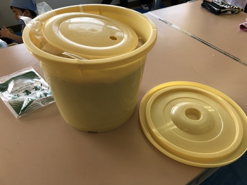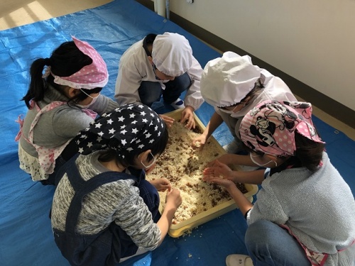 JAの方に教えていただき育てた大豆で味噌づくりをしました。蒸した大豆と塩を混ぜ、かたまっているこうじをほぐし、こうじと大豆を混ぜました。その混ぜたこうじと大豆をミンチ機にかけて細かくしました。それを丸めてたるに入れて仕込みが終了です。あとは冷暗所で約1年保管して熟成完了です。おいしい味噌になりますように。