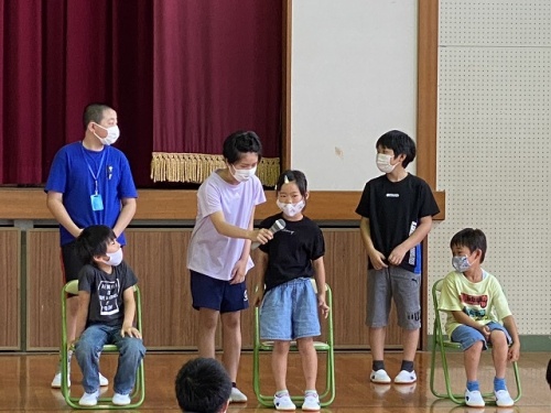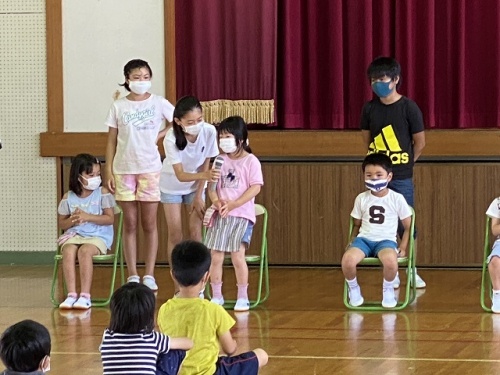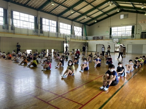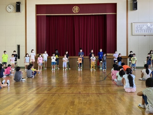 延期になっていた1年生を迎える会を6年生が企画運営してくれました。事前に1年生にインタビューしたことをクイズにして1年生のみんなの紹介をしました。6年生は事前の聴き取り、準備、片づけをがんばりました。最高学年としての自覚も出てきているようです。1年生もみんなの前で自分の名前やクイズの答えを堂々と言いました。その後の休み時間は1年生と遊ぶ姿がいつもより多かったように感じました。