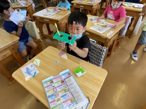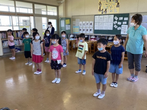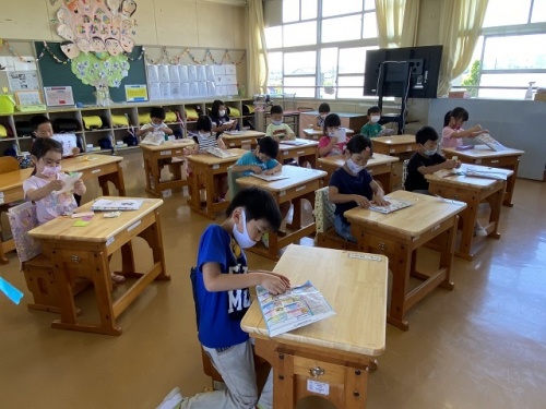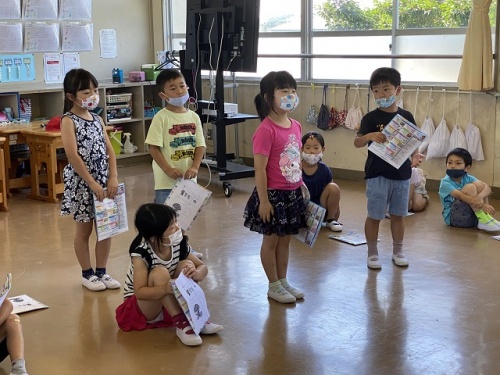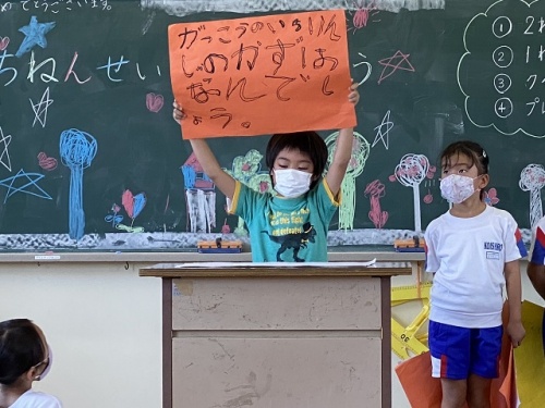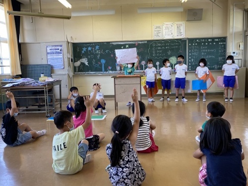 2年生が準備をしてくれた「いちねんせいをむかえよう」が行われました。プロフラムは①自己紹介②クイズ③プレゼント渡しでした。クイズは「体育館にあるボールの数は?」「先生の人数は?」「こいしろ秋まつりが行われる場所は?」などを三択でこたえるものでした。最後に1年生が感想を言ってお礼の気持ちを伝えていました。教室に戻った1年生はもらったプレゼントを見て嬉しそうに友だちと交流していました。