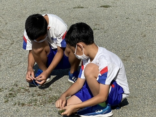 学校のグランドに草が目立つようになってきました。校務員さんがグイランド整備をしてくれていますが、毎日草との戦いです。今朝グランドを見ると1年生の子と5年生の子が草をとっていました。自分たちのグランドをきれいにしようと思う気持ちがうれしかったです。