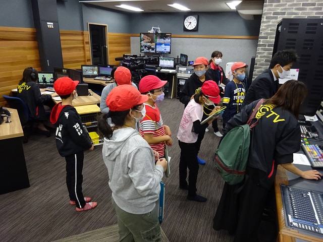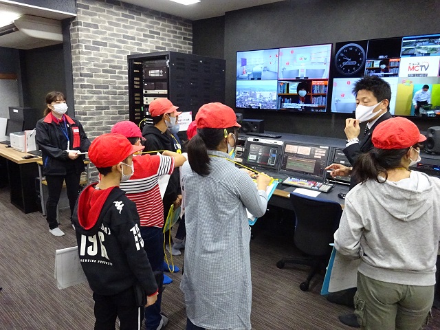松阪ケーブルテレビでは機器の説明をしてもらった後、ニュースキャスターの体験をさせていただきました。先日取材を受けた「文化体験プログラム」の様子のビデオも視聴しました。