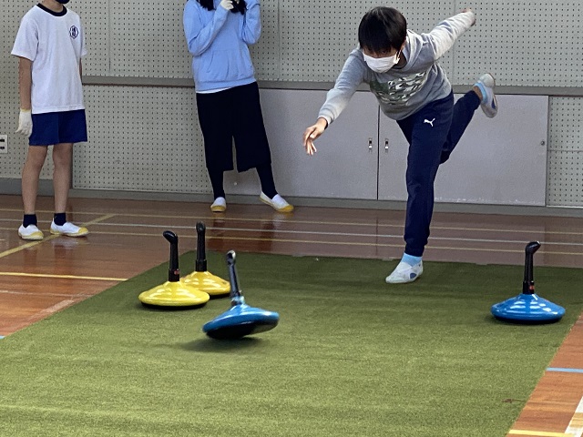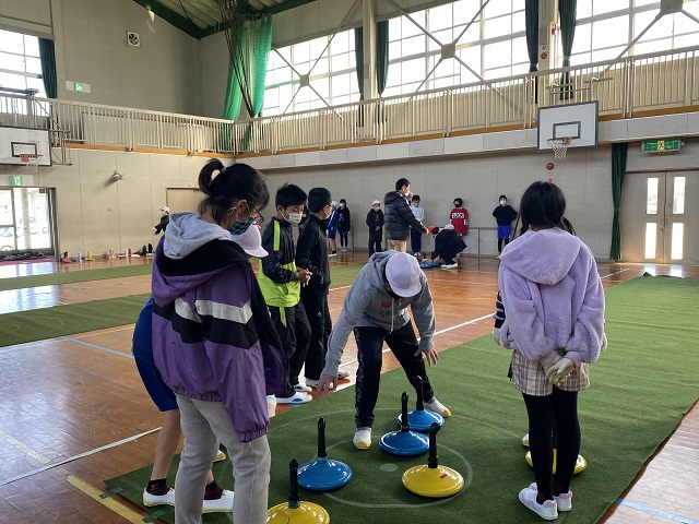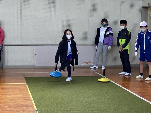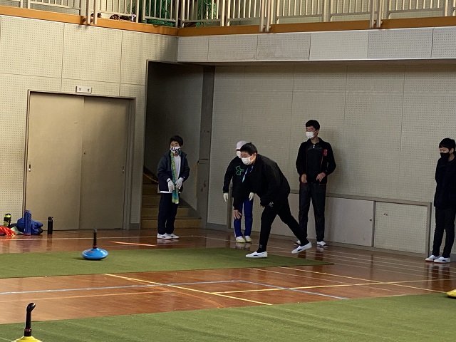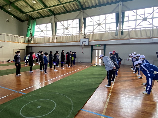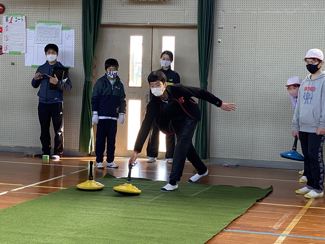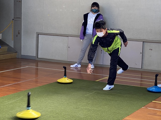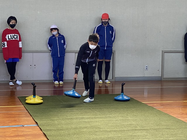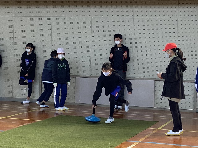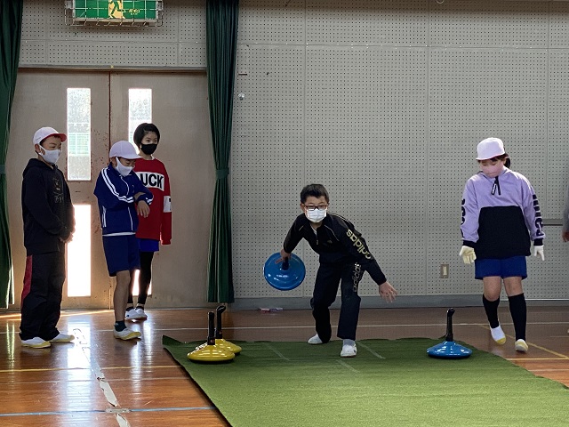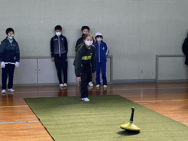 漕代小学校、機殿小学校、東黒部小学校の三校合同交流学習会を行いました。6年生25人、5年生15人(機殿・東黒部)計40人が機殿小学校の体育館でユニカールをしました。ユニカールとは専用カーペットの上でプラスチック製のストーンを滑らせるスポーツで、冬季オリンピック種目のカーリングを屋内でも手軽に楽しめるようにと考案されたスポーツです。味方チームのストーンを相手チームのストーンよりもセンターサークルに近づけることを競います。